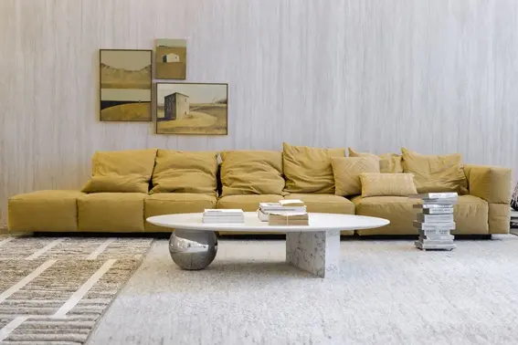 Já Melina Romano, que assina o ambiente Caminhos Portinari, com 200m², mergulhando na essência da marca – que celebra a arte brasileira em suas criações e homenageia o legado de um dos maiores pintores do país – concebeu uma casa que desvenda os novos rumos da expressão e da criação em suas múltiplas faces. Para o espaço, Melina escolheu o sofá Block, do estudiobola, na cor Mostarda, que oferece extremo conforto com enchimento em diferentes densidades de espuma e almofadas em pluma.
